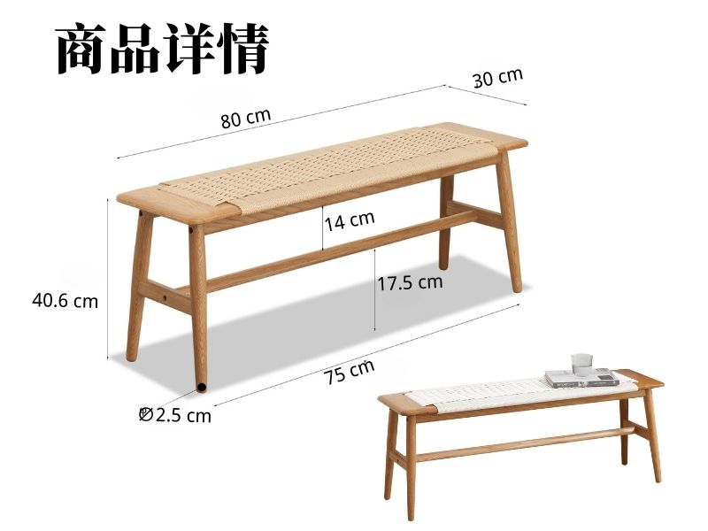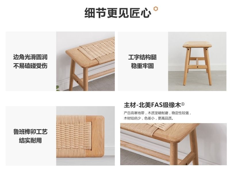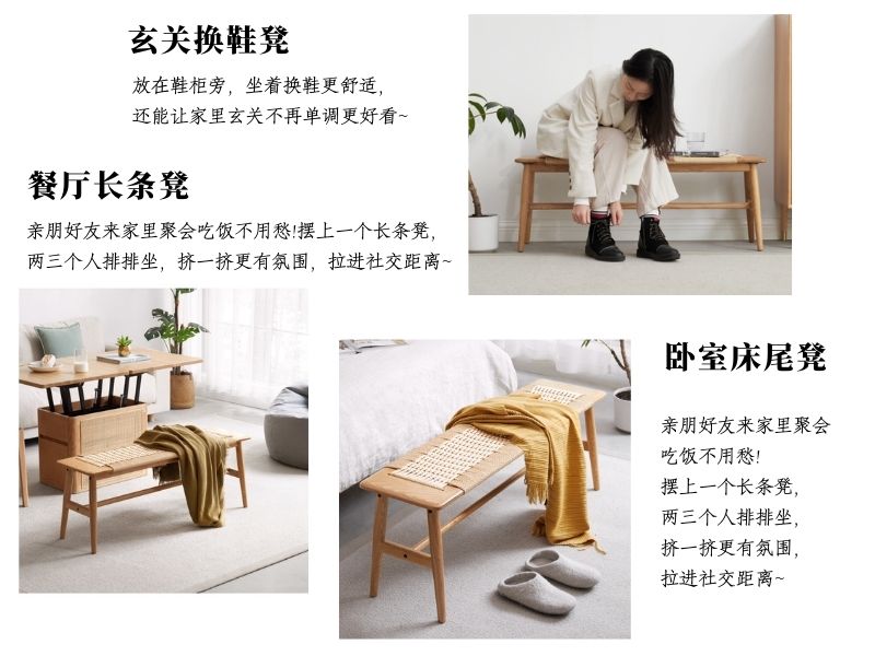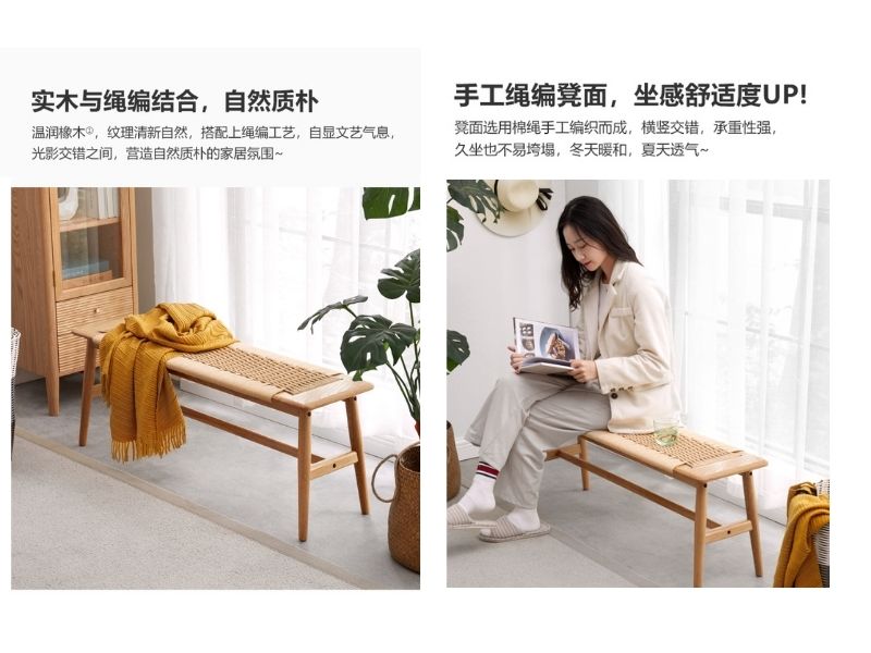 实木绳编长条凳简约家用板凳北欧现代餐厅家具橡木长椅